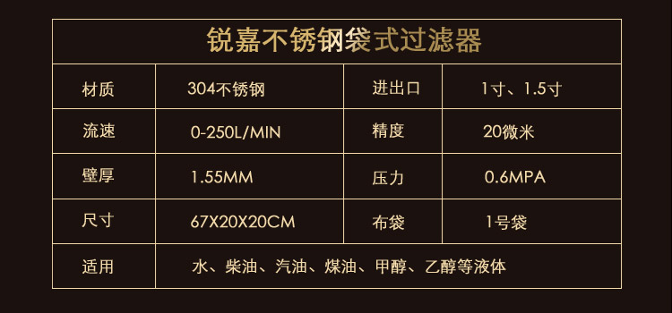 銳嘉不銹鋼袋式過濾器是一種新型的袋式過濾器,可過濾水、柴油、酒精等各種液體,布袋統一采用1號,袋如有特殊需求,可聯系我們定做。